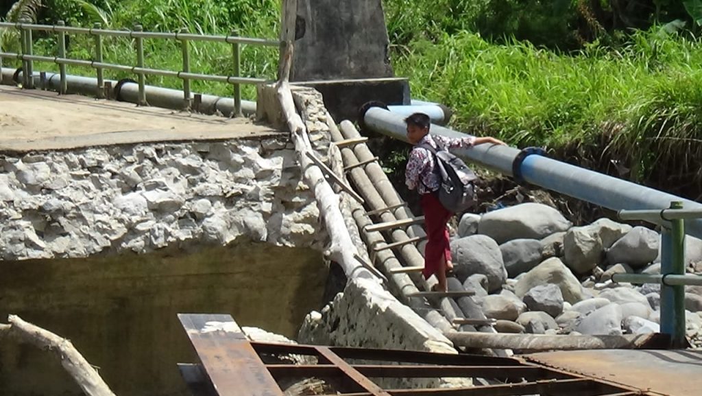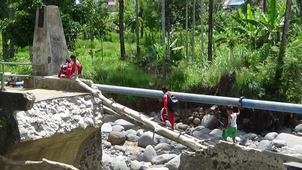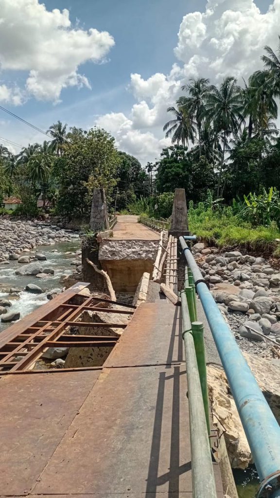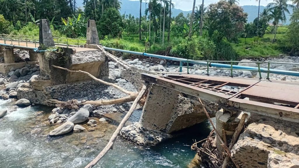 Banjir bandang yang terjadi setelah hujan deras dengan intensitas tinggi mengakibatkan debit air sungai meningkat secara signifikan. Arus deras membawa material kayu, batu, dan lumpur yang menghantam struktur jembatan hingga akhirnya tidak mampu menahan tekanan air dan runtuh.