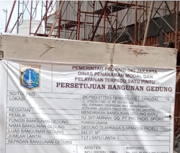 Bangunan tersebut mengantongi PBG dengan Nomor SK PBG-317503-19092025-005. Namun, berdasarkan izin yang diterbitkan Suku Dinas Cipta Karya, Tata Ruang, dan Pertanahan (Sudin Citata) Jakarta Timur, bangunan itu seharusnya hanya difungsikan untuk dua lapangan. Fakta di lapangan menunjukkan, bangunan tersebut justru dibangun menjadi tiga lapangan padel.