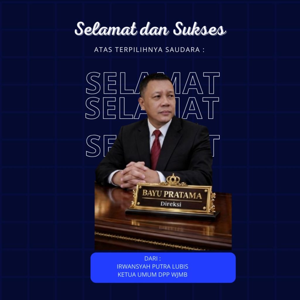 “Atas nama pribadi dan keluarga besar DPP WJMB, saya mengucapkan selamat dan sukses kepada Saudara Bayu Pratama atas jabatan barunya sebagai Direksi. Semoga amanah, profesional, serta mampu menjalankan tugas dan tanggung jawab dengan integritas tinggi,” ujar Irwansyah Putra Lubis.